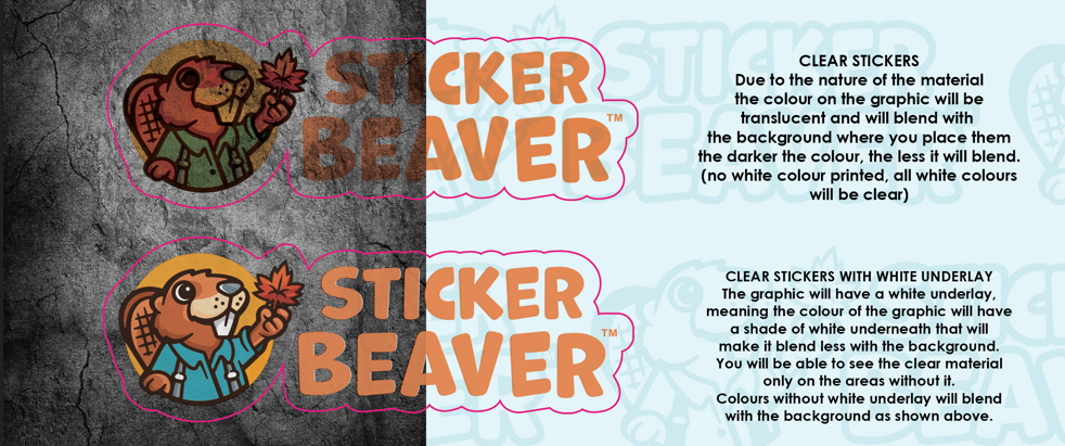 - Clear background stickers, unlike cheap paper stickers, they won’t break, fade, or disintegrate when exposed to the elements, great for a clean sticker application, print your clear stickers with white ink printing for a great contrast in applications where a background is not necessary.